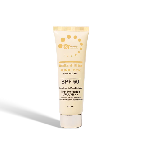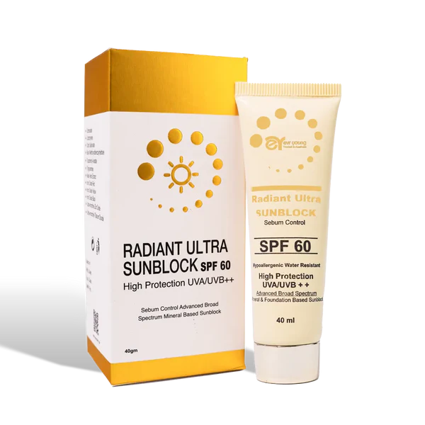 Radiant Ultra Sunblock SPF 60 Sebum Control offers broad-spectrum protection against UVA, UVB, and HEV rays, shielding your skin from sunburn, tanning, and premature aging. Formulated with Zinc Oxide and Titanium Dioxide, this oil-free, lightweight, and water-resistant sunscreen ensures maximum protection without clogging pores.